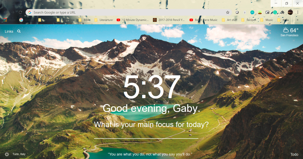 Momentum is a browser extension. The way it works: this screen (example shown above) pops up every time you open a new tab. It displays the time, your main focus for the day, a neat little quote at the bottom, the weather, and it can store a to do list and any links you’d like to bookmark. The background is a gorgeous high quality picture that changes every day.